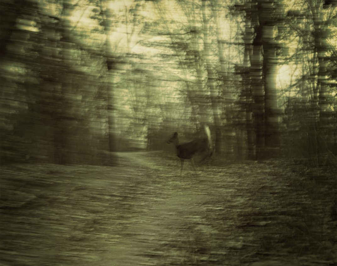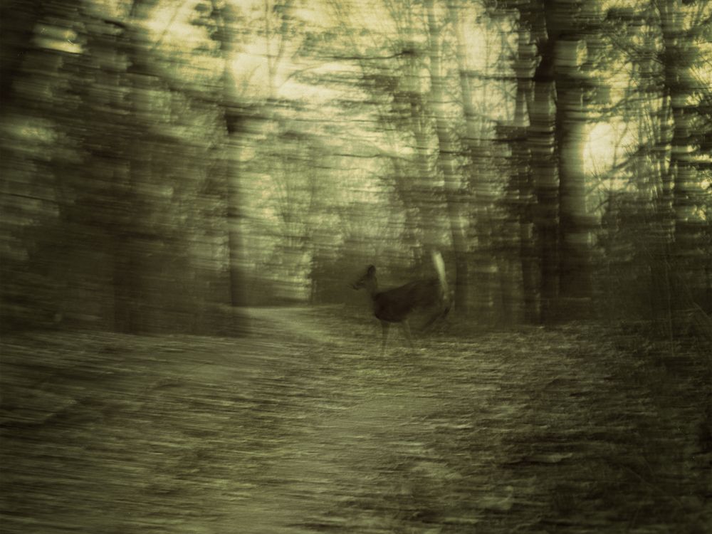 This is a photograph of a deer running across a path in the woods near my house. Through dark, atmospheric photographs of the neglected, overgrown places where I grew up, I explore landscapes as unresolved as the memories they mirror. Twisted vines and forgotten paths reflect the shame and rage I’ve carried from past abuse. Capturing the sense of being lost and searching for something I never truly knew. These images become a visual meditation on what is taken, what remains, and the quiet hauntings held in both bodies and place.