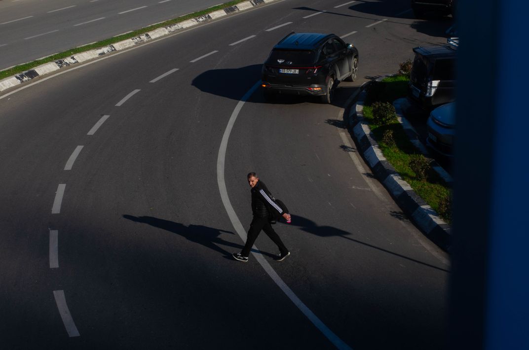 This image is an abstract study of light, shadow, and movement within the strict geometry of the urban road network. Captured from a high perspective, the photograph shows an individual crossing the street, his long shadow stretching across the asphalt. The composition uses the road markings and the curve of the highway to frame the subject. The severe contrast between the brightly lit areas and the deep shadows emphasizes the man's solitude and the graphic, almost painterly, quality of the modern streetscape.