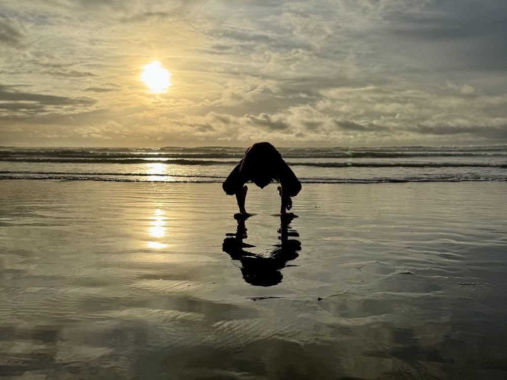 Crow pose at Morro Strand State Beach in Morro Bay, CA. This is a 14 year old that just got done playing an Ice Hockey game for the Santa Barbara Ice Hawks. There was a break in the storm, just enough time to get some yoga in.