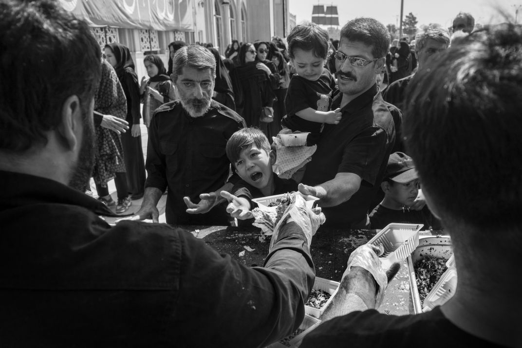 In 2025, in the courtyard of a religious site in the city of Isfahan, Iran, during the distribution of free food, a child who had been waiting in line for a long time protests against people cutting in line.