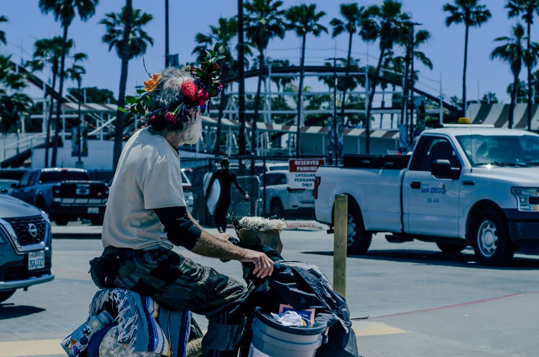 A homeless man rides on his bike as he gazes at a rollercoaster ride and amusement park in the distance. The image feels like a "what if" moment of wonder for the subject.
