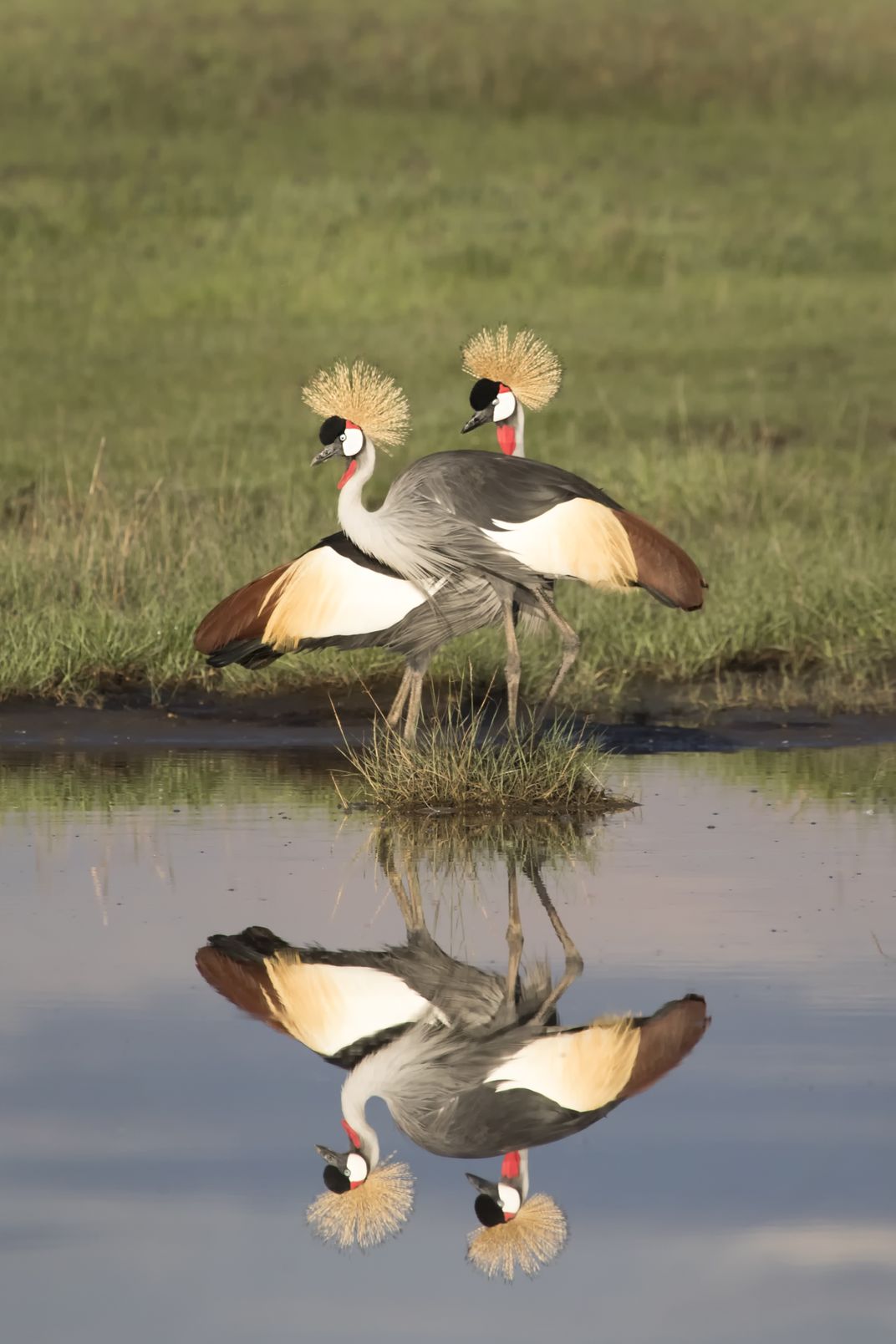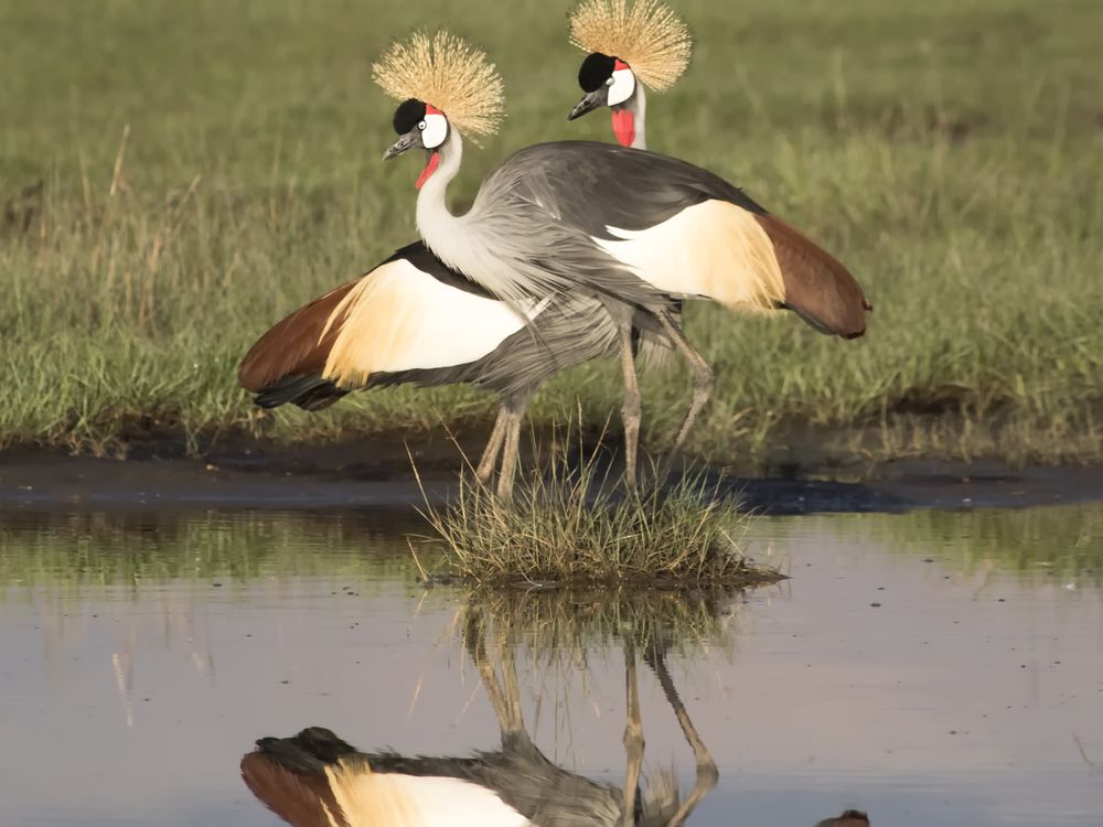 These crowned cranes were glowing in the morning sunlight and beautifully reflected in the pond.