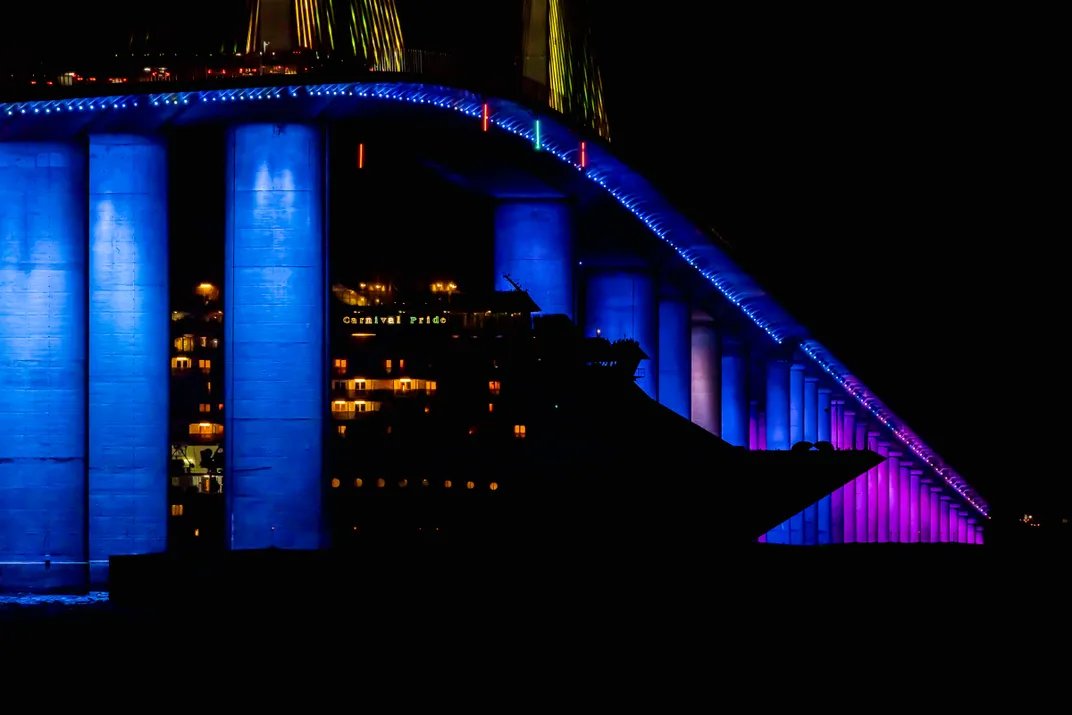 From Skyway North Fishing Pier, Carnival Pride can be seen sailing under the Sunshine Skyway Bridge while the Skyway’s light display theme was changing colors. The photograph was framed for the “Carnival Pride” branded lights to just clear the column while keeping the cruise ship bow in the light.