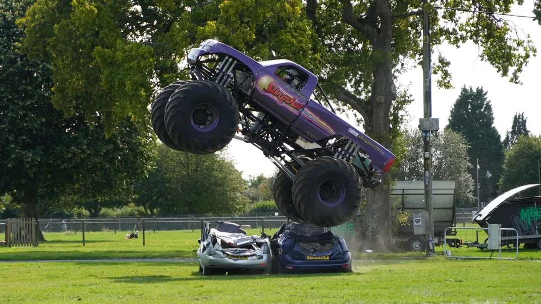 This is a newer alcohol guzzling monster truck, driver central, with four wheel steering monster trucks, doing one of the classics, crushing or running over standard cars