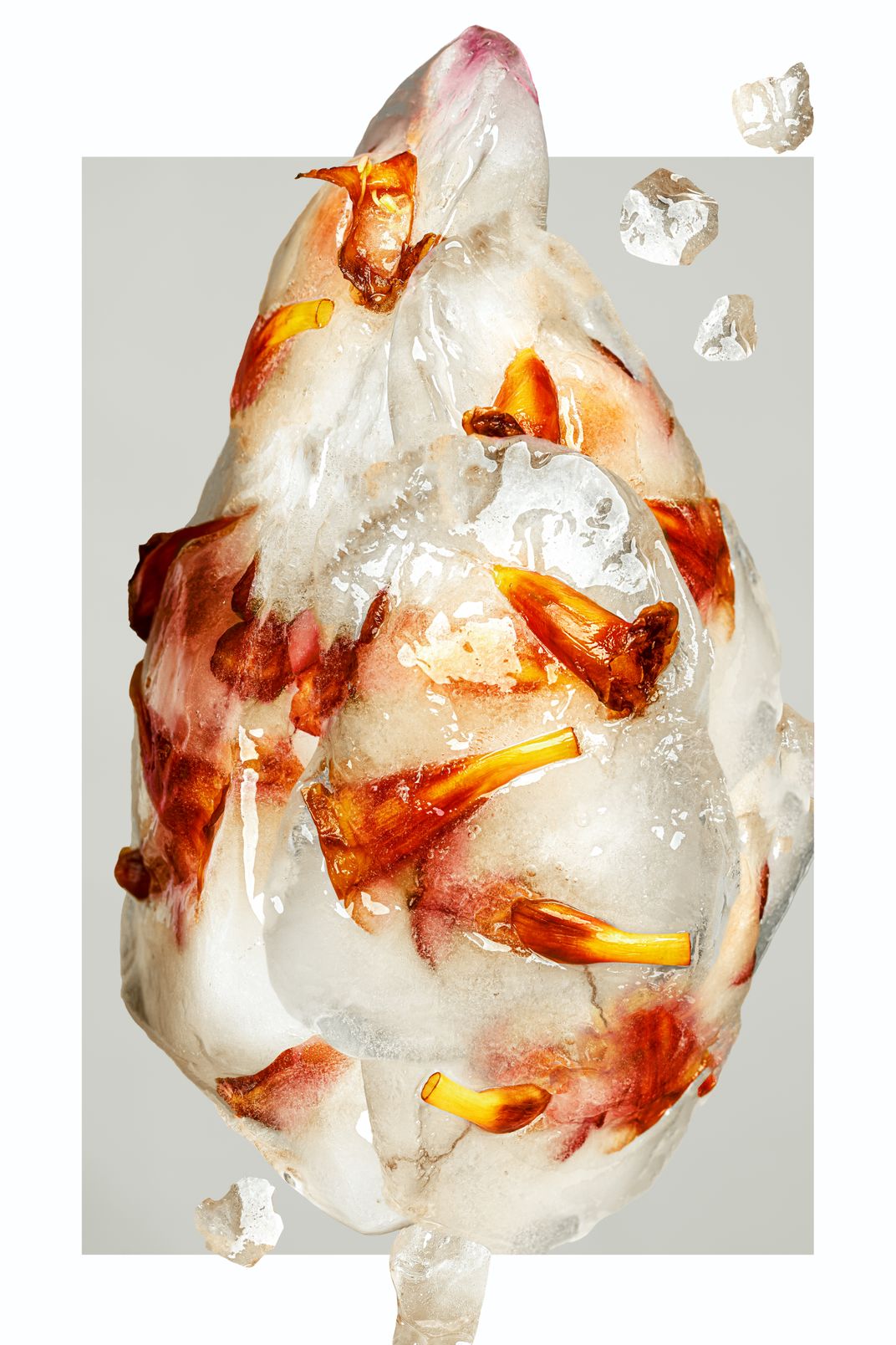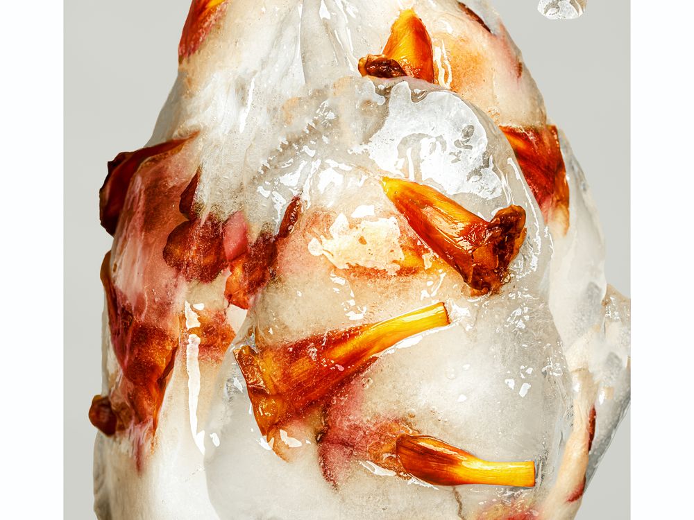 Flowers were submerged in water, sealed in plastic bags and put in freezer..where then photographed and edited together to resemble a flower in the shape of a heart