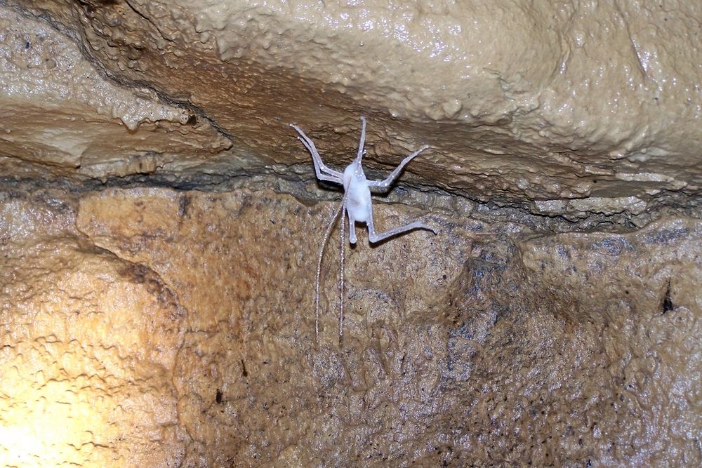Crystal Caves KY, Crystal Skeleton of Cricket hanging on ceiling of cave.