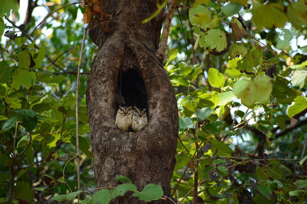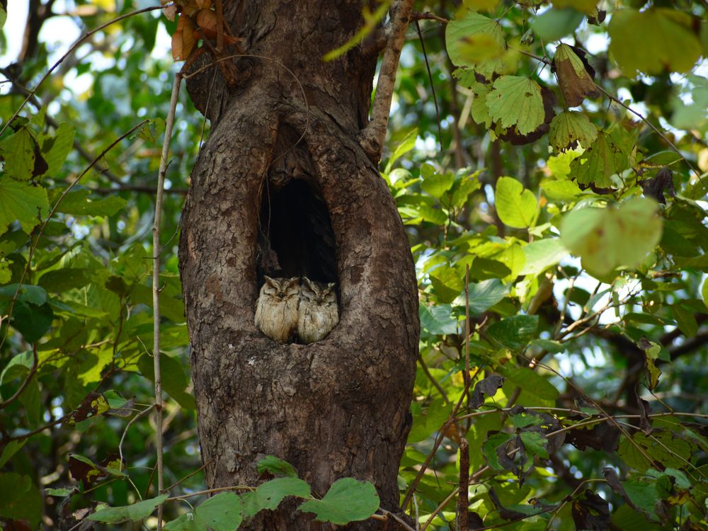 2 Indian Scops Owl blend together in a hollowed rest. Peace won't be so close as night falls at Kanha Tiger Reserve, Madhya Pradesh, India