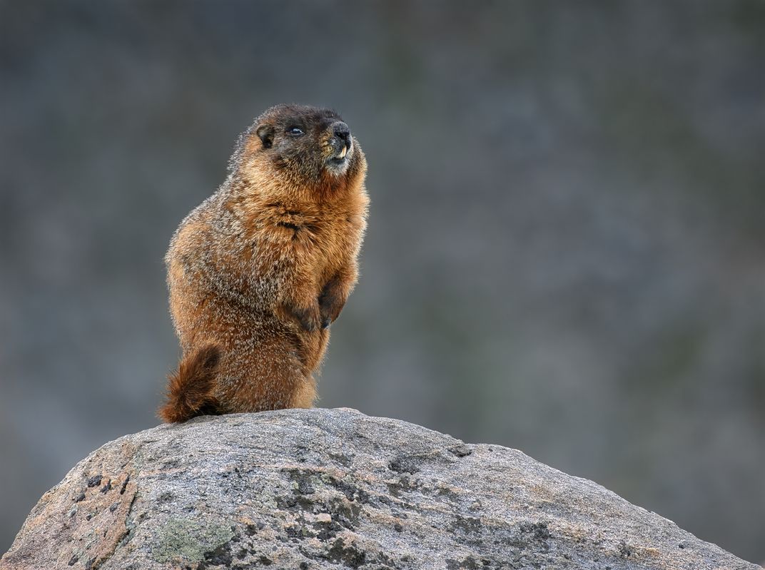 A yellow-bellied marmot emerges from a long winter hibernation on Mount Blue Sky, Colorado and is intrigued with a landscape filled with the bustling activities of mountain goats, bighorn sheep, brown-capped rosy-finch, and people.