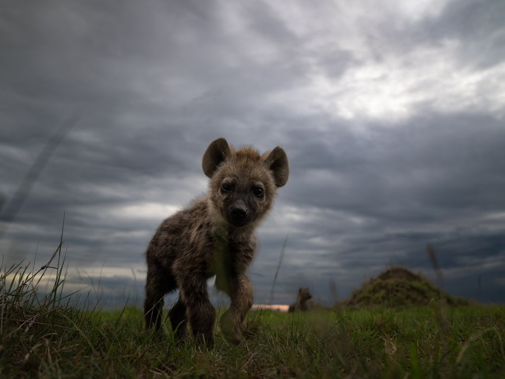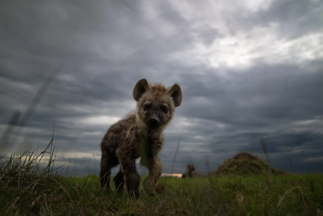 One evening as the sun started to hang low in the sky, we arrived at a hyena den. I attached my camera to a monopod and lowered it to the ground. This young hyena became ever so curious of my lens that it decided to take a closer look.