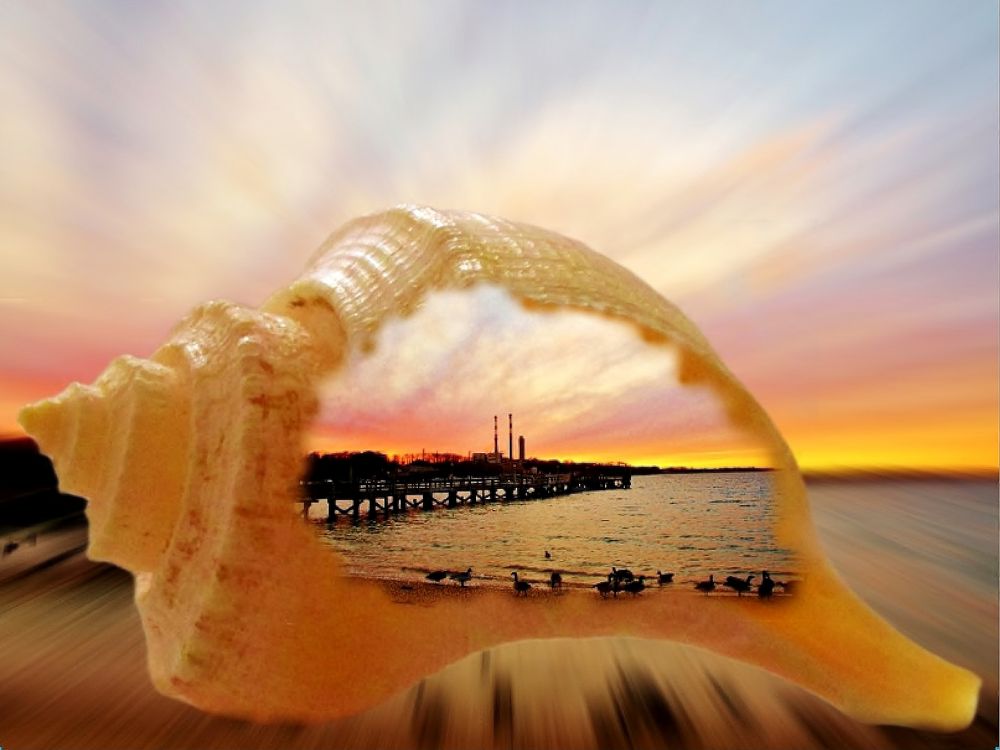 Seeing is believing. Photo of damaged conch shell I found on the beach overlaid against a blurry photo of the sunset in Port Jefferson harbor. As a child I was told that if you hold a seashell to your ear you would be able to hear the ocean. I thought how about a photo looking into a shell?