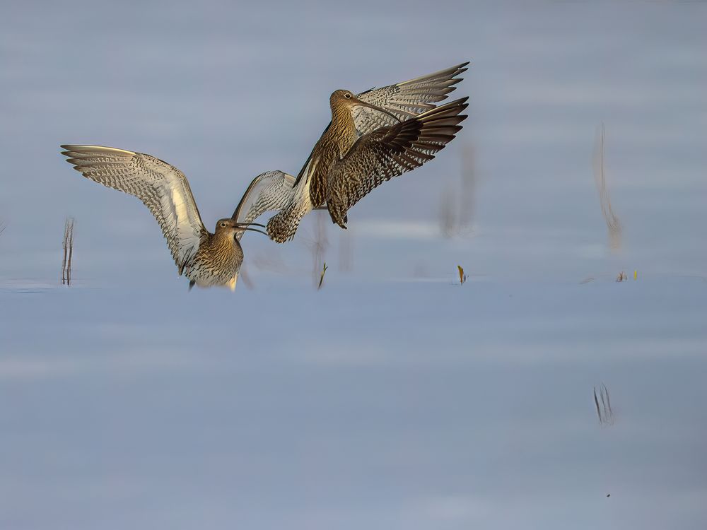 These two Curlews were the first who had migrated to north-eastern Finland. The ground was covered by snow, but it did not prevent the curlew couple's display.