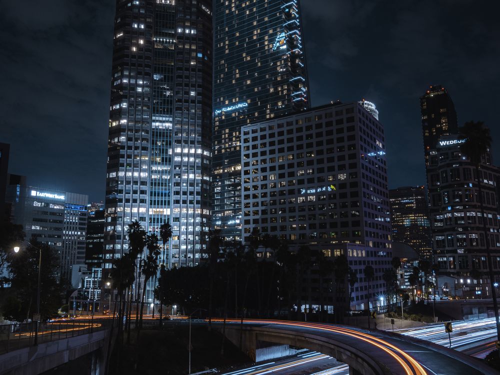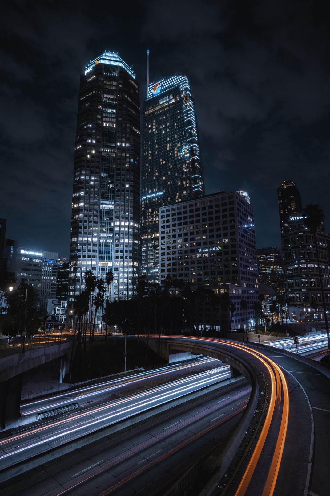 A long exposure taken of Downtown Los Angeles as traffic rushes by below.