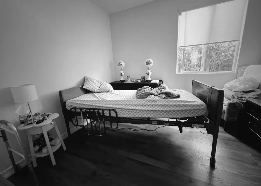 On a sunny Saturday morning, a nurse from hospice arrived, filled out the death paperwork, and with the help of the funeral home men, rolled my mother away. I went to her empty disheveled room, took this shot, and broke down crying. For those who have sat vigil by a dying loved one for days, a loved one's death creates a discombobulating void that in your state of sadness and exhaustion is impossible to process in the moment. My neat and tidy mother's room empty and in disarray reflected my emotional state.