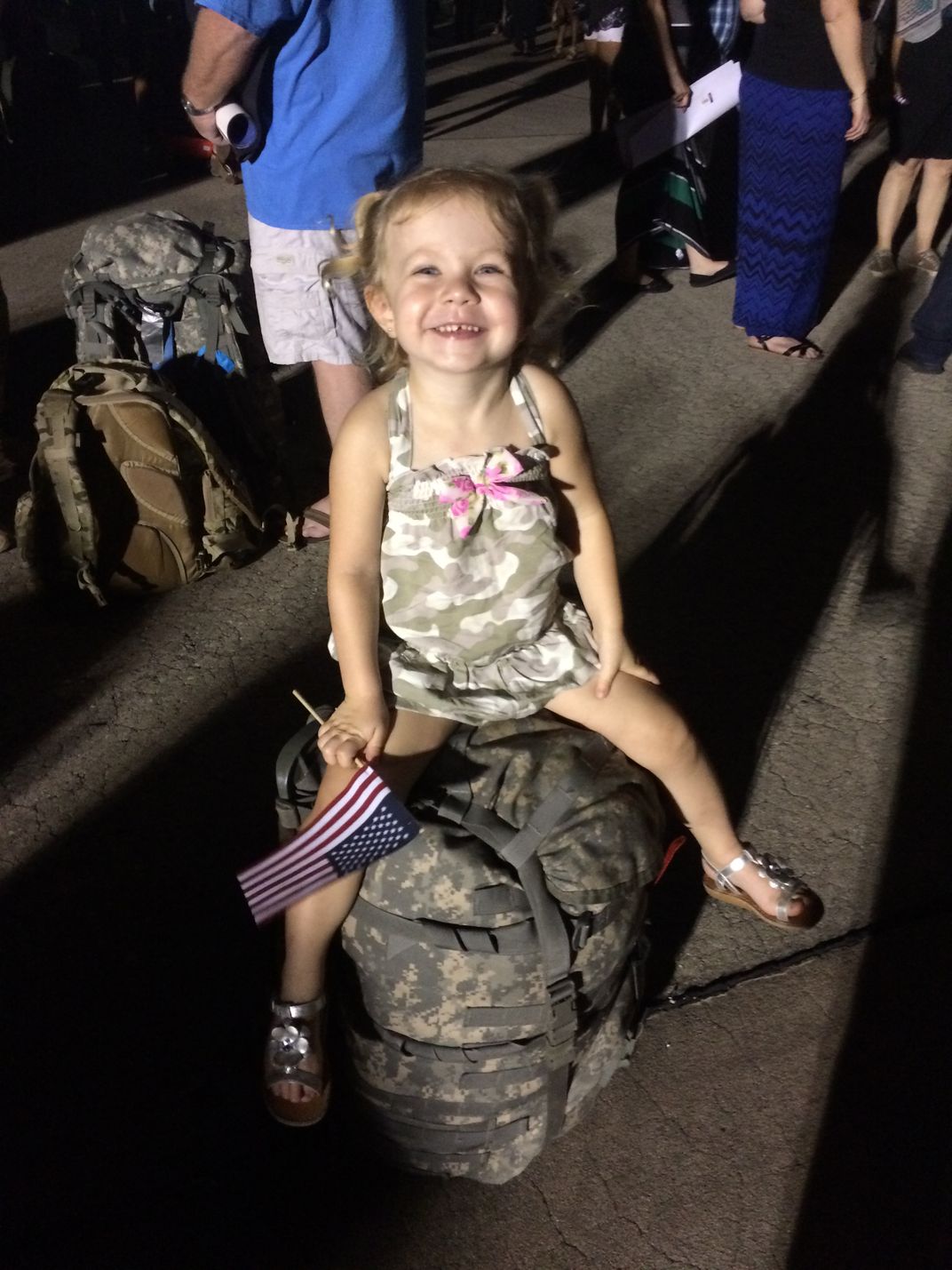 This is a picture of a little girl that is so excited her daddy is home from being deployed 10 months in Africa. It is 10pm which is way past her bedtime but she still waves that flag proud.