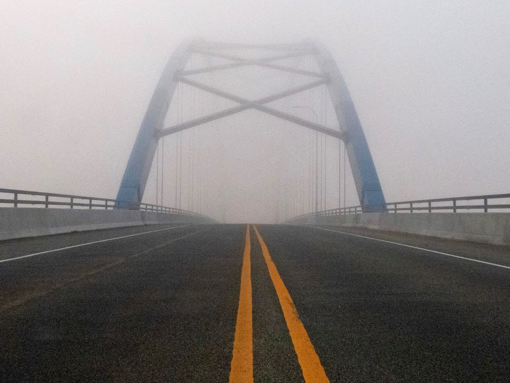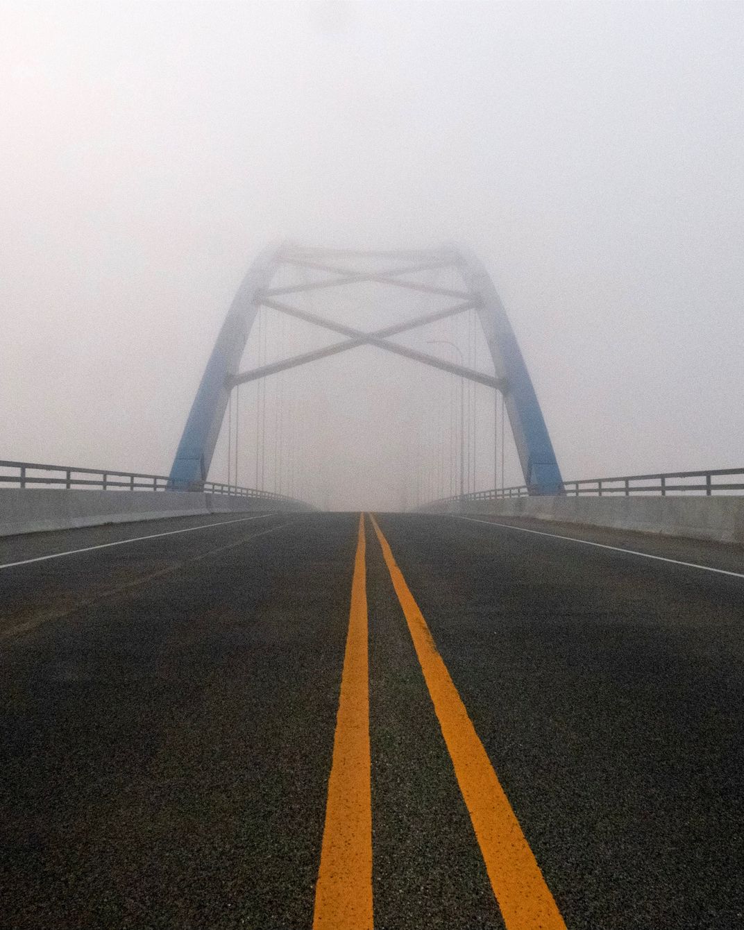 Dale Gardner Veterans Memorial Bridge disappearing into an early morning fog