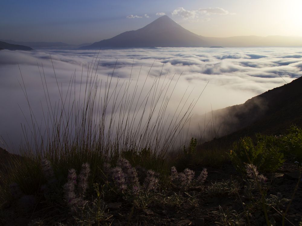 Mount Damavand with a height of 5610 meters and the sea of clouds below it with wild mountain tea in the foreground