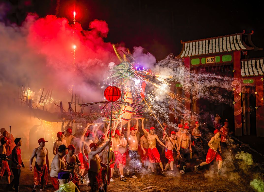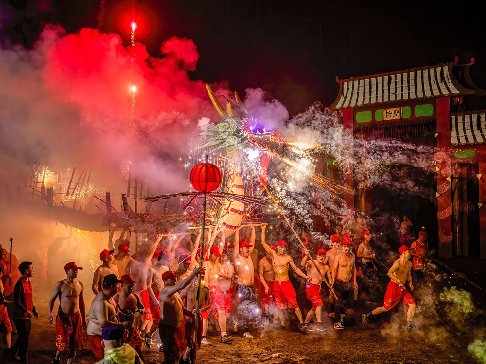 The picture is taken of the fire dragon dance, a New Year folk activity in Chaoshan, China. It is also a national intangible cultural heritage and one of the most visually striking performances in Chaoshan. Hundreds of people were holding the ignited dragon body and running quickly. The fireworks of the dragon body fell like a waterfall, and the scene was extremely shocking!