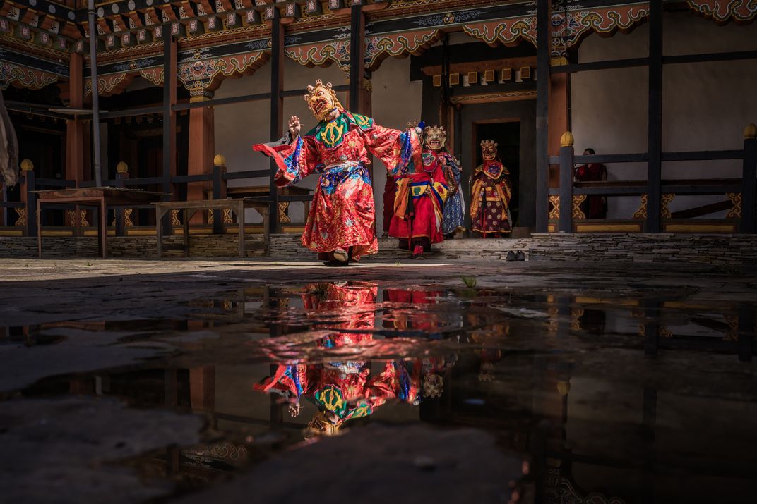 As sunlight spills into the dzong courtyard, masked monks, traditional cham dancers, step into the ritual space. Their vibrant robes and mirrored reflections shimmer in a puddle, creating a powerful contrast between earth and spirit. Each movement honors Bhutan’s deep spiritual heritage, where tradition and devotion come alive.
