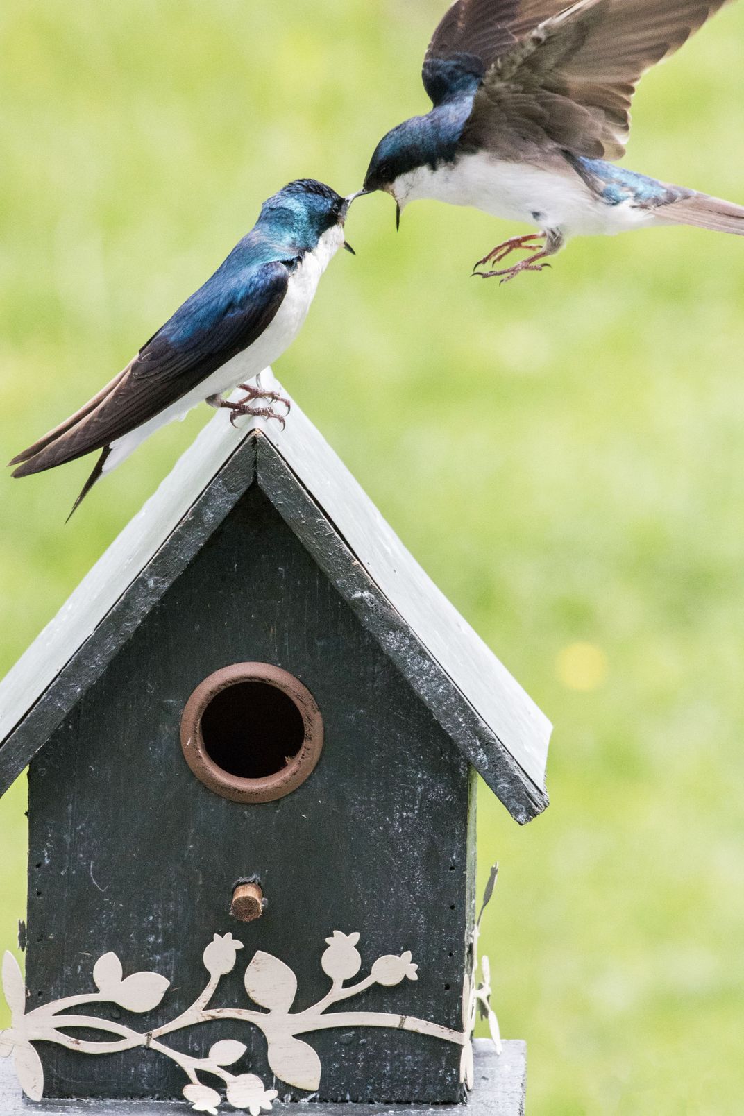 Two sparrows exploring a new, shabby chic birdhouse.