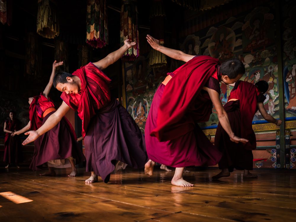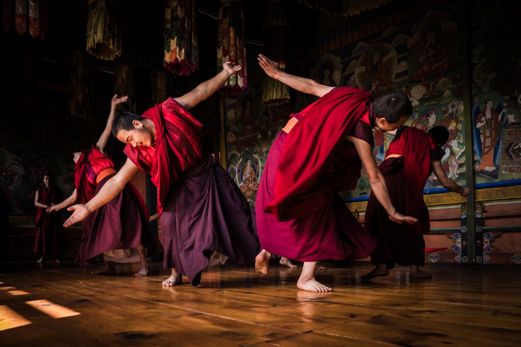 Monks in Jakar Dzong in Bhutan move in unison, practicing sacred cham dances. Their flowing robes and focused gestures embody centuries of devotion and discipline.