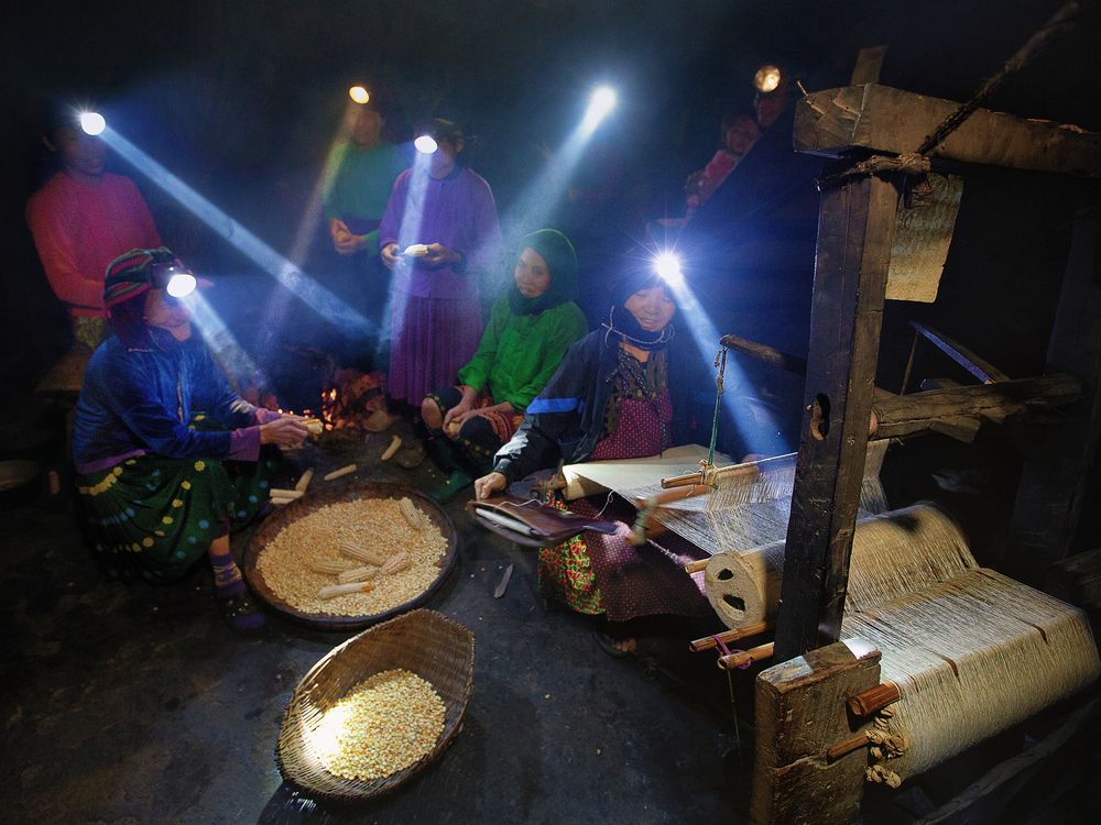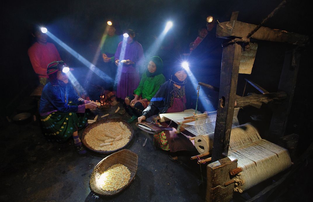 The women wear headlamps as they work in the warm kitchen, while outside the cold winter rain falls. Inside, only cheerful laughter fills the space, and the light from their lamps seems to dance around.
