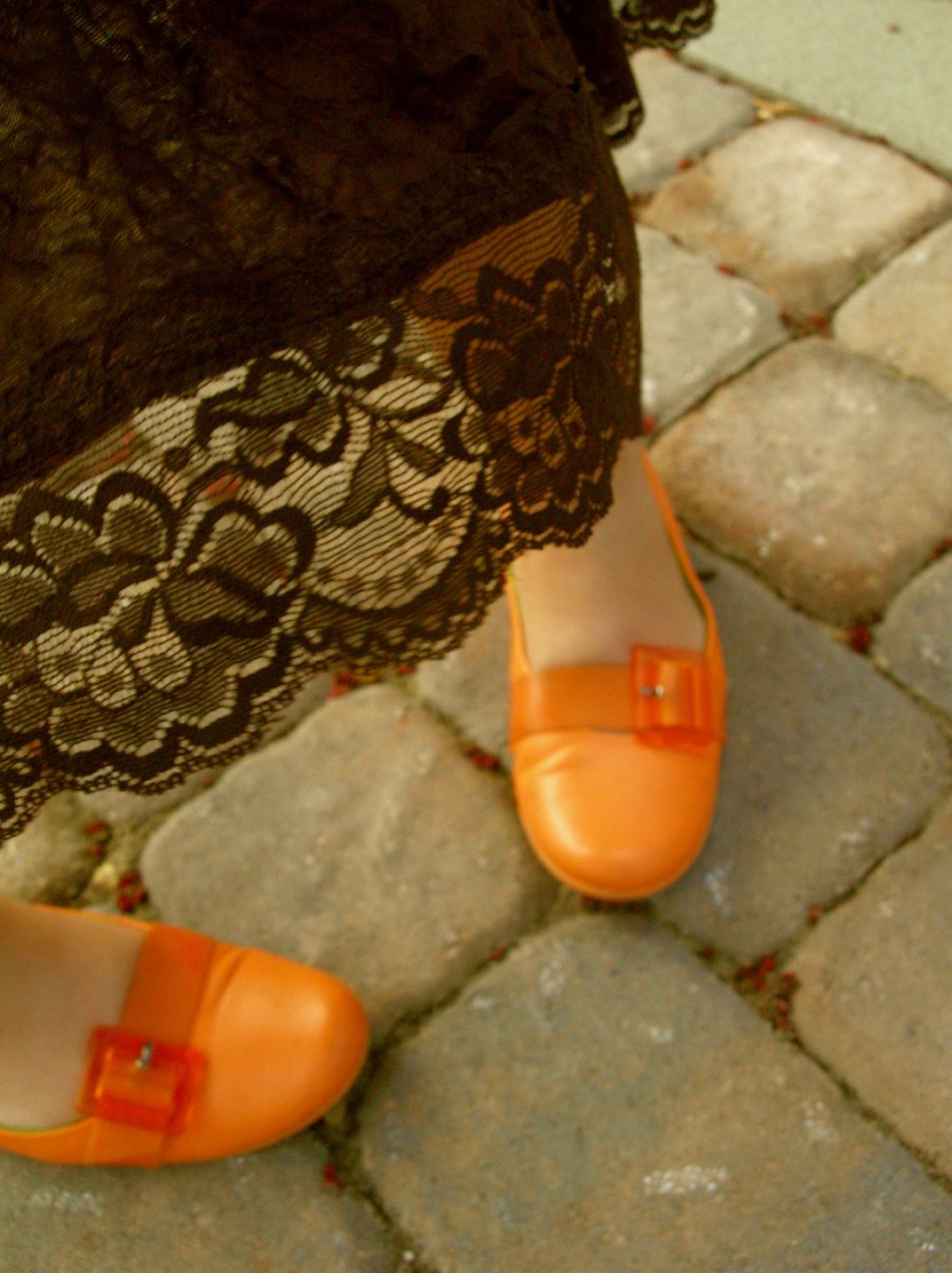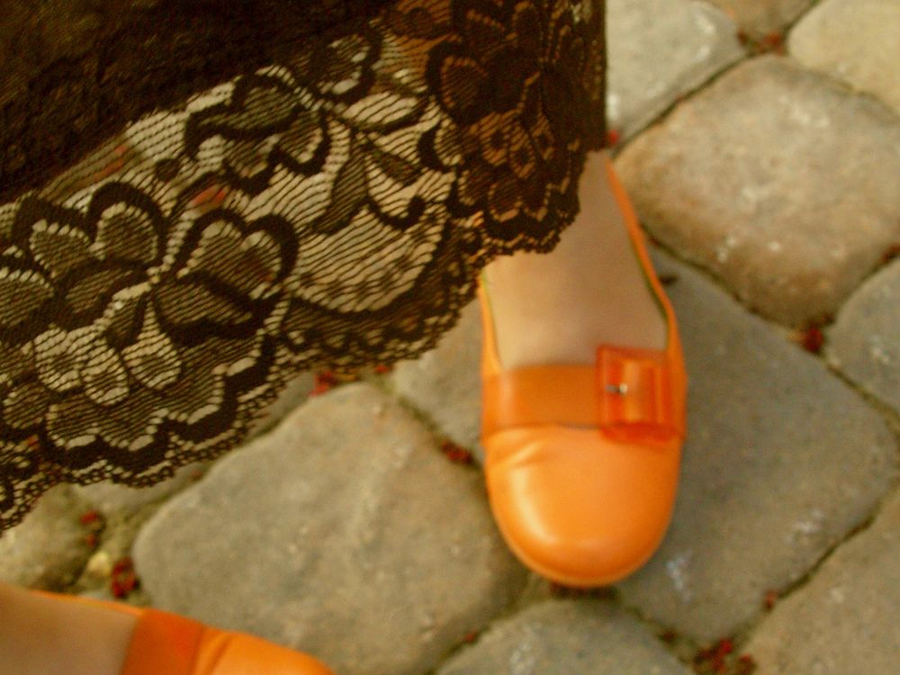 Dancing on an uneven path in my backyard, flairing my skirt and sporting my orange retro shoes.