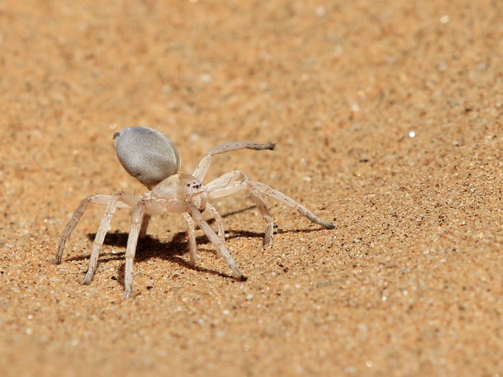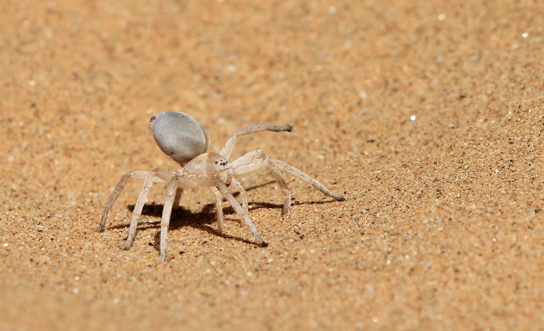 A Dancing White Lady spider begins dancing as the photographer gets in close to get the shot. These spiders are endemic to the Namib desert and begin mating by having the male tap dance on top of the female's burrow, thus giving the spider its name.
