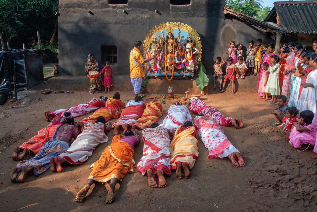 Dandi is a ritual, where devotees, either alone or in groups, perform this act as a form of extreme devotion and penance. They lie flat on the ground on their stomach and pray to the concerned deity. In this picture, Durga Puja or worshipping of the Hindu Goddess Durga is being performed in a village in West Bengal. The women have gathered in groups and are praying for peace and harmony. The Durga Puja is 10 days long festival. It portrays the victory of good over evil. According to Hindu mythology, Goddess Durga overpowers evil Mahisasura, the buffalo demon.