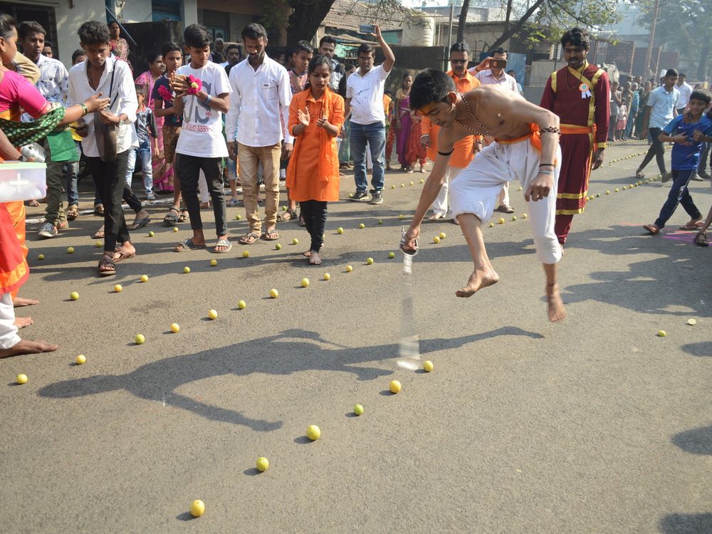 The Dandpatta is a type of sword. Though used as a weapon in the times of Chatrapati Shivaji Maharaj, now it is used as a form of martial arts. Several acts are performed. One such act is cutting or slicing the lemons. It is a very skilled task and requires a lot of practice. These acts are performed only during certain festivals or at competitions nowadays. One such act is seen here which was a part of a competetion. This art can be seen only in very few cities in my state.