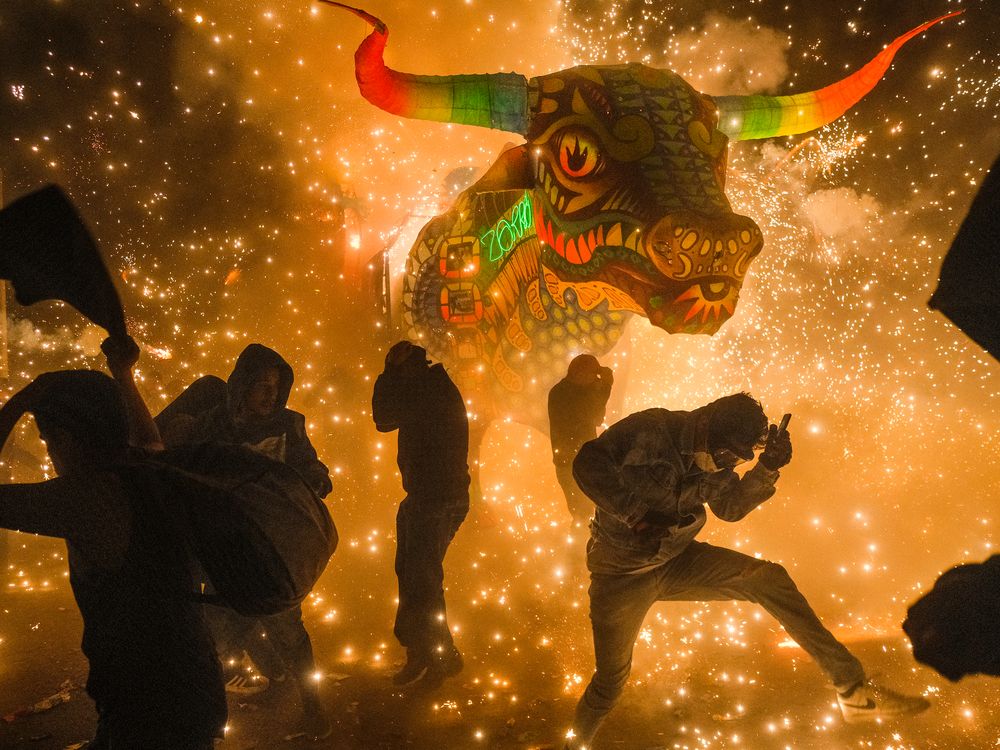 Every March 8 in Tultepec, the capital of fireworks and home of the masters and warriors of fire, the patron saint of fireworks, San Juan de Dios, and the ancestral god of fire, Huehueteotl, are celebrated. People spend weeks or months working on their bull that will be burned as part of the devotional offering of fire, blood and fireworks as proof of their faith and bravery. And that is how that night becomes the same hell on earth where thousands of people dance the dance of fire around and under the fire and sparks that become stars becoming for a few moments a party in the universe.