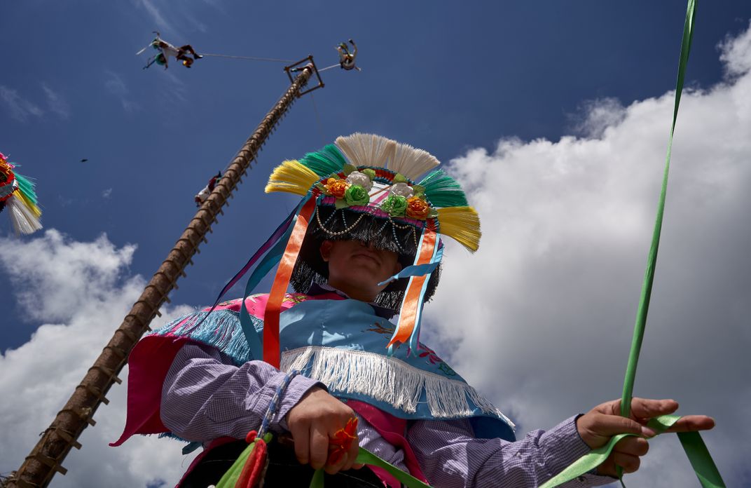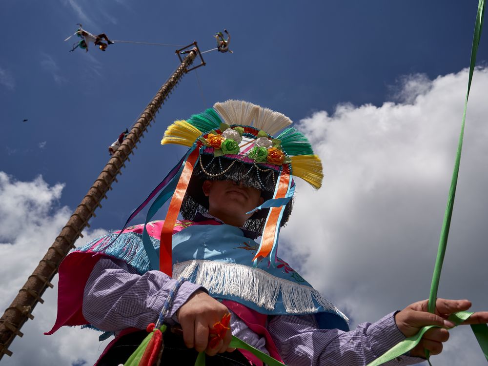 A dancer in traditional festival attire stands in the foreground of the main church square in Cuetzalan. Seen from a low angle against the bright blue sky, his colorful headdress of ribbons, flowers, and fringe partially hides his face while he holds long green ribbons in his hands. In the background, the tall pole rises above the scene, where the Voladores de Papantla spin in mid-air during the town’s patron saint festivities.