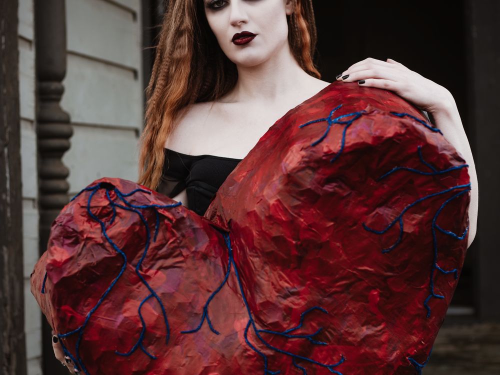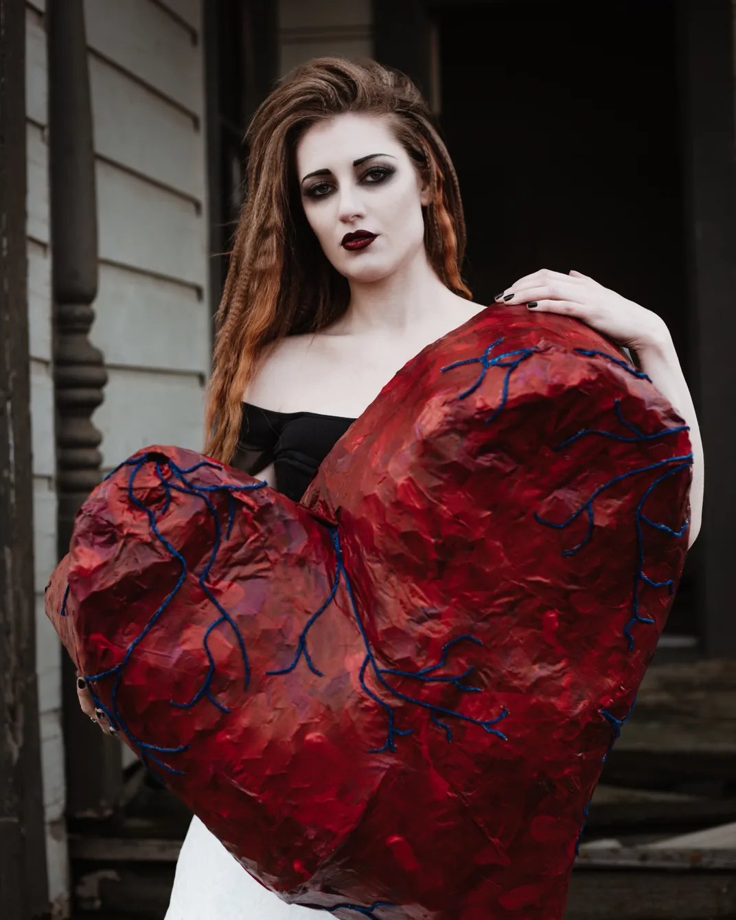 A portrait of a woman holding a large paper-maché heart on the steps of a decaying house.This is an individual portrait in a series of portraits of a beautifully unique couple. The heart is representative of their undying love.
