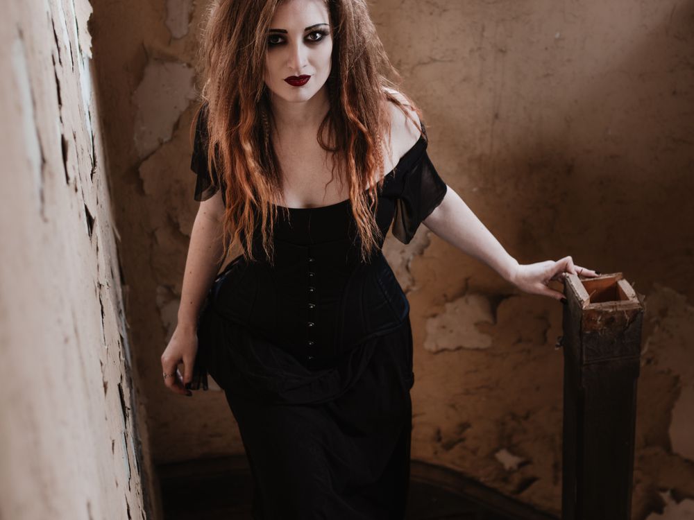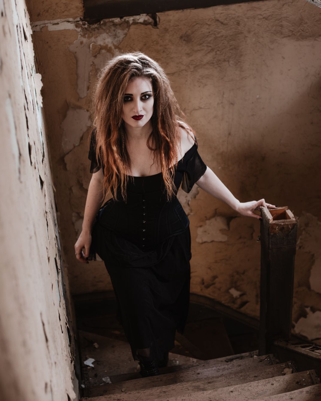 A dark and moody portrait of a woman ascending a staircase inside a decaying house.