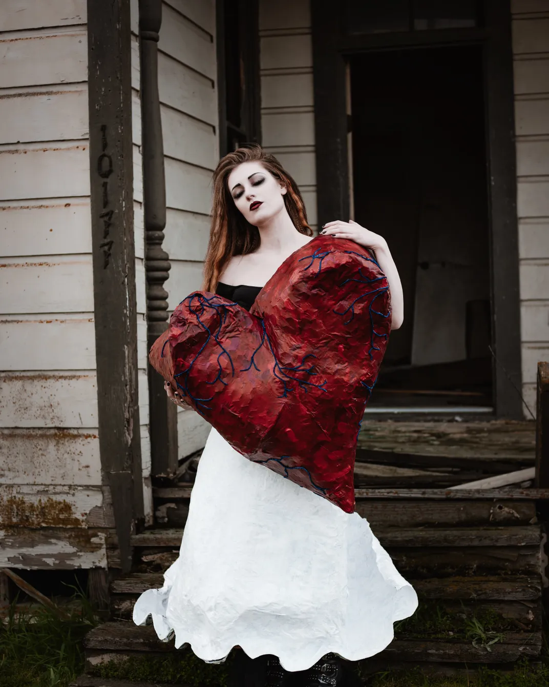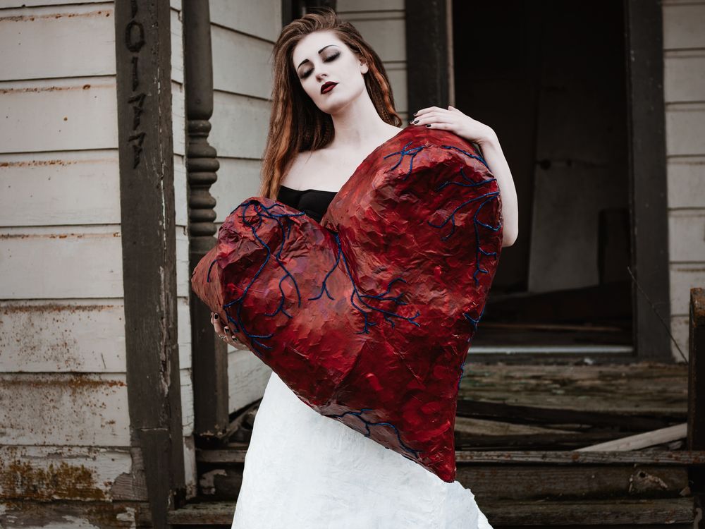 A portrait of a woman wearing a paper mache skirt and carrying a large paper mache heart on the steps of a decaying house.This is an individual portrait in a series of portraits of a beautifully unique couple. The heart is representative of their undying love.