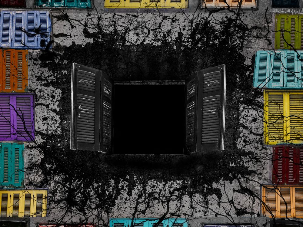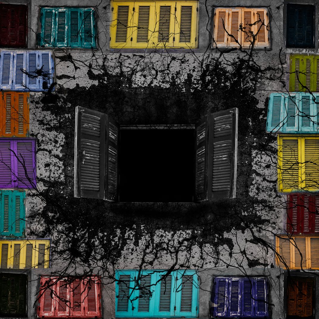 A single open window releases a spreading darkness that consumes its surroundings, while the remaining shutters remain closed and vividly colored. Built from real windows photographed in northern Egypt, the piece explores the contrast between concealment, exposure, and the quiet power of what lies hidden.
