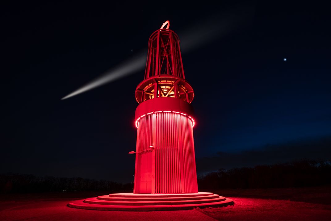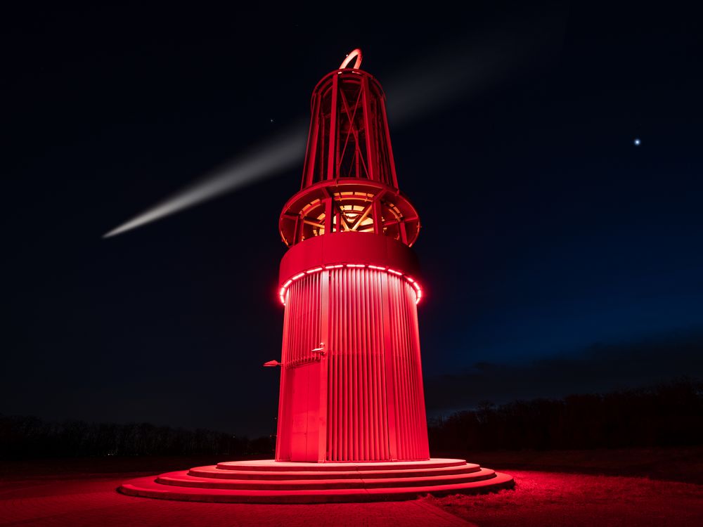 "Das Geleucht" by Otto Piene on the former Rheinpreußen mine dump in Moers, Germany. This 28-meter-high, ruby-red light sculpture is a massive tribute to the region's coal mining heritage.