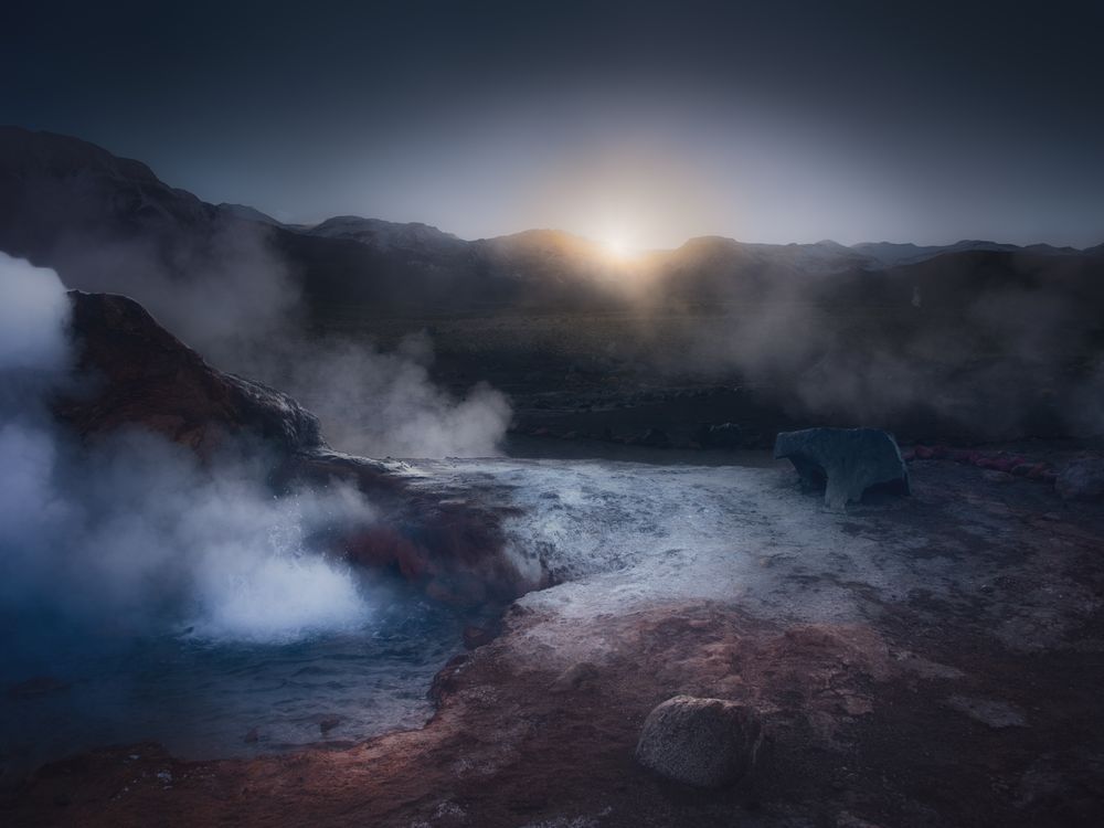A lunar landscape opens up before your eyes as the sun rises over the Tatio geysers.