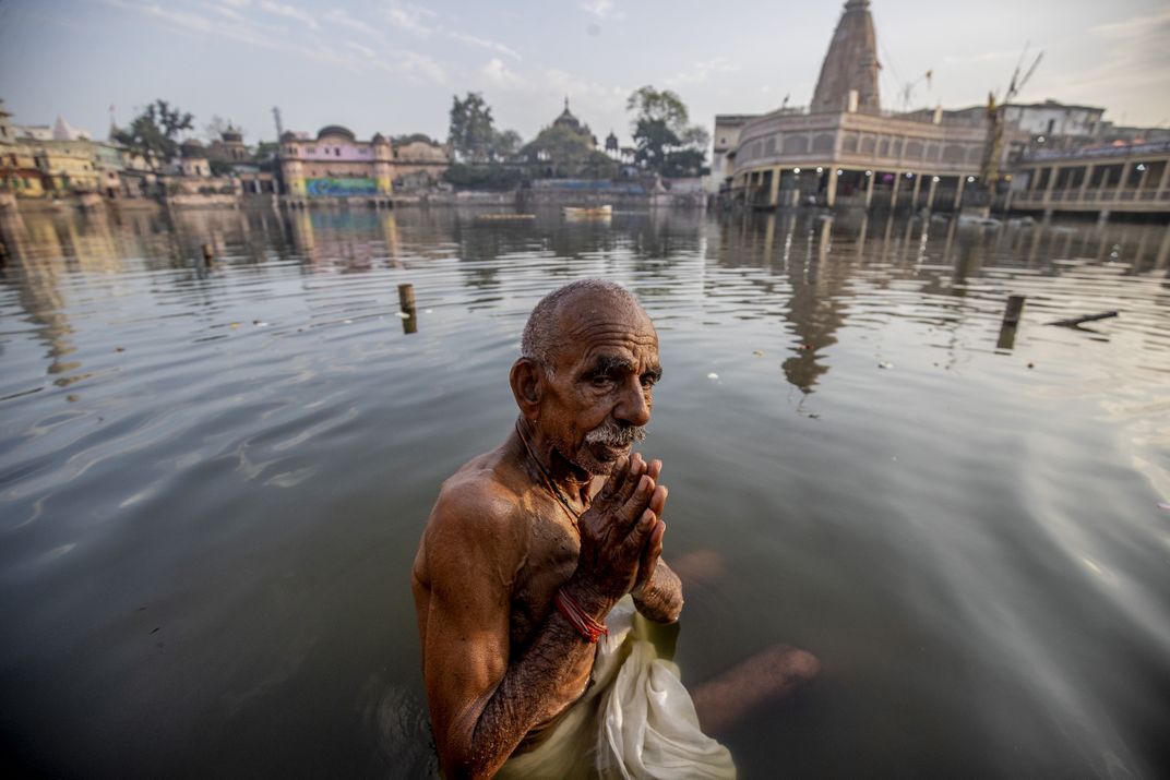 A monk bathes in a sacred lake not far from Vrindavan, immersed in the quiet rituals of dawn.