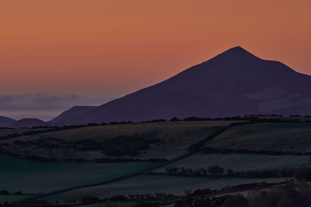 Typical Irish farmland in the foreground leading to majestic Great Sugarloaf mountain in the background photographed at dawn. It's those morning and evening twighlight times that render outstanding color tones highly regarded by photographers.