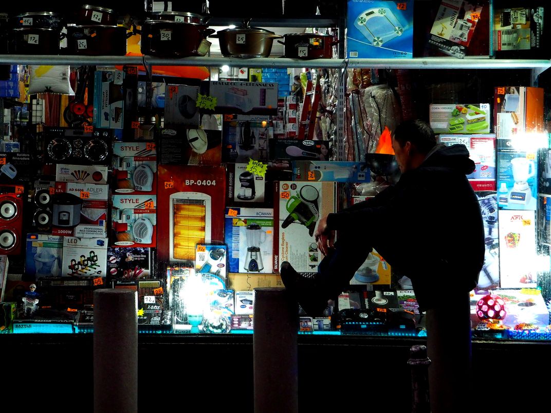 I was walking through the street of Madrid. The first time I passed by this man he was sitting there, watching those tools, maybe daydreaming about only he knows what. After a while I came back and curiously he was still there, watching the same tools, daydreaming about his own life.