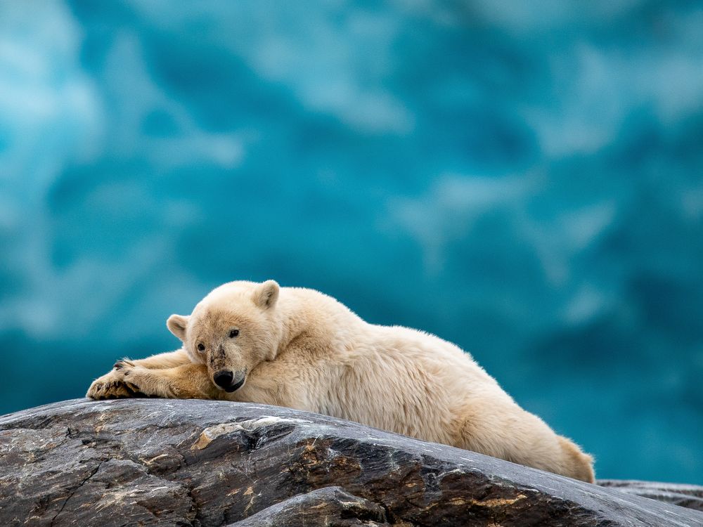 An young polar bear relaxing on a small granite isle in front of the ‘Nordenskiöldbreen’ glacier. Spitsbergen island, Svalbard.