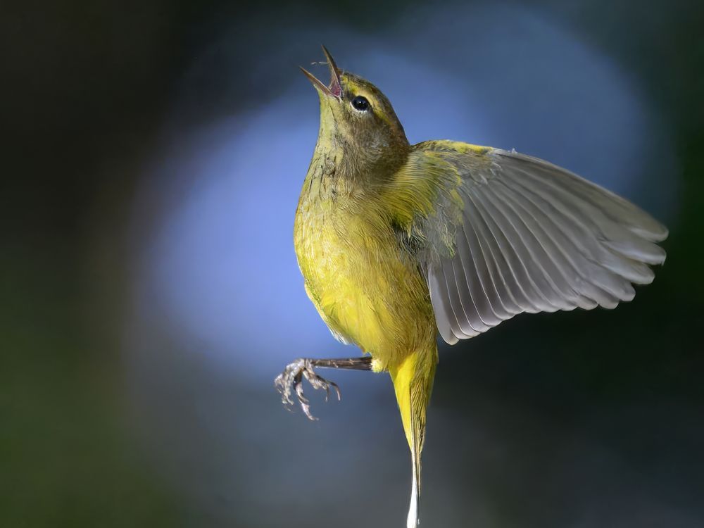 A palm warbler in flight and bite.