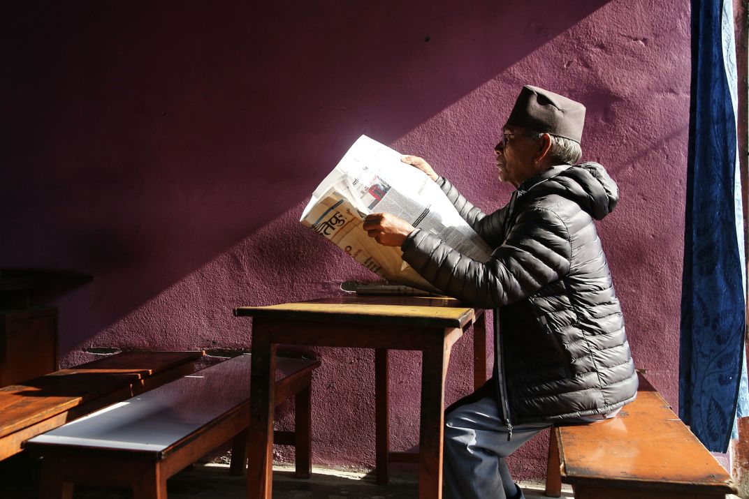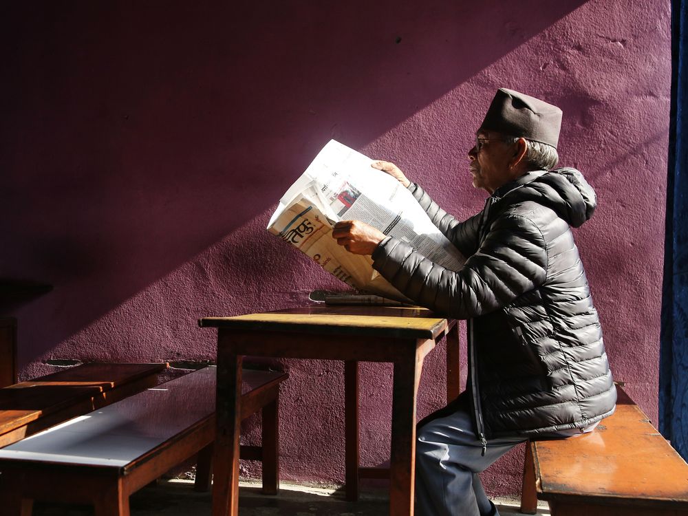 A man reads a newspaper in a teahouse in Pokhara, Nepal.