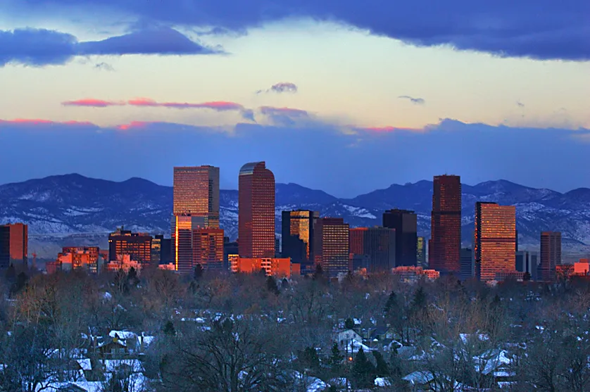 Denver and the Rockies in the last rays of sunset.