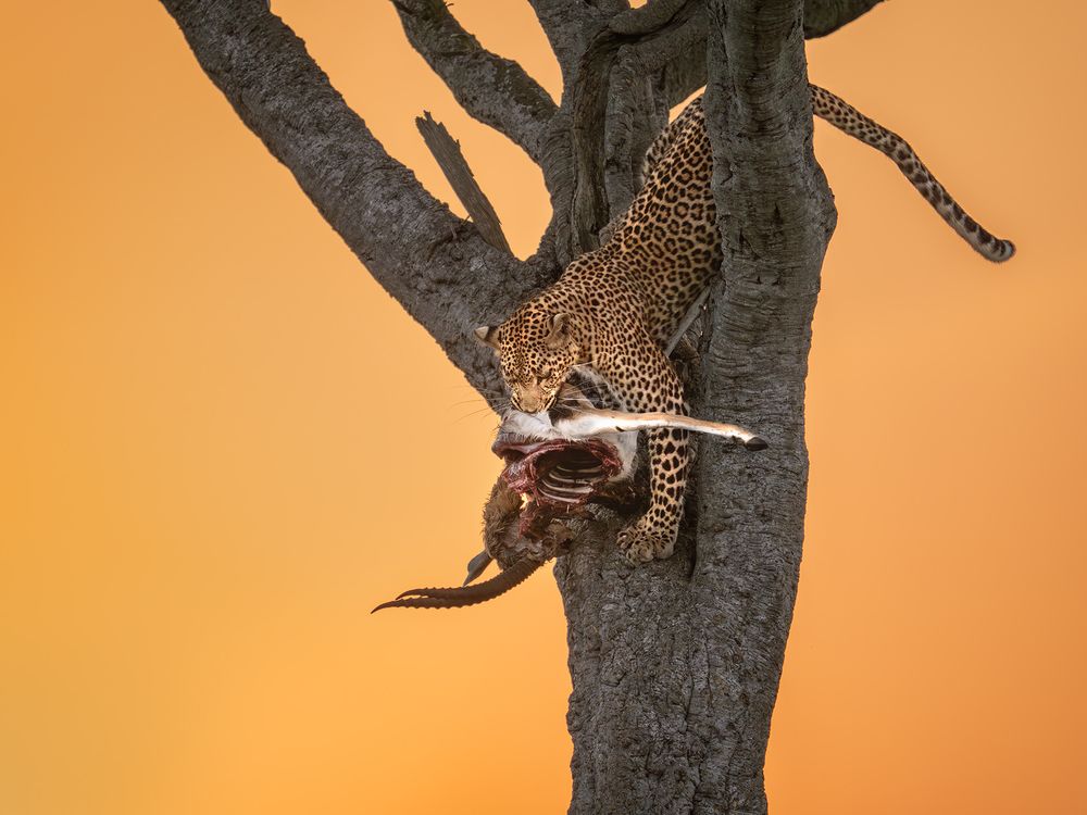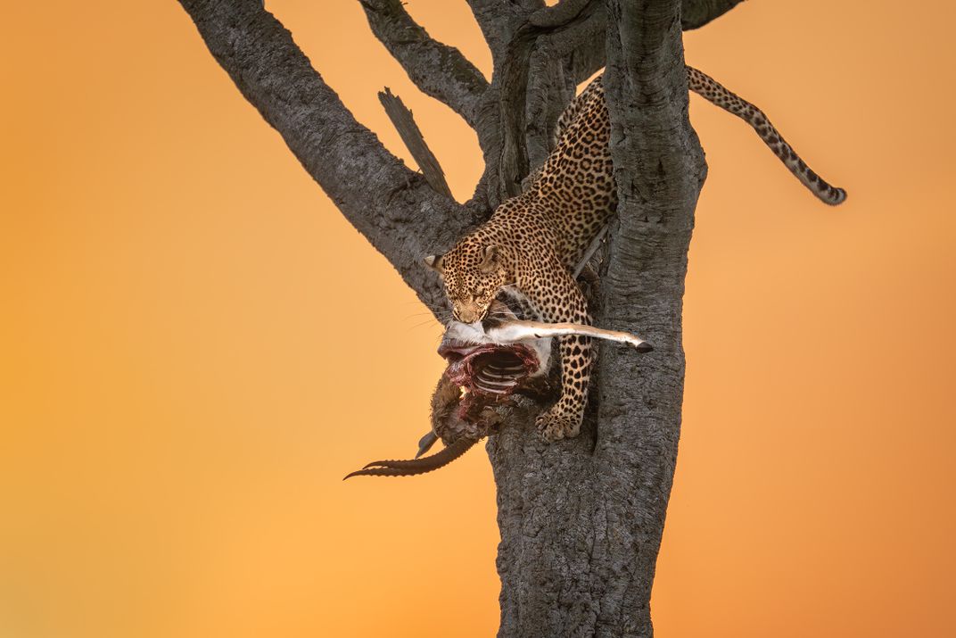 At daybreak in Kenya’s Maasai Mara National Reserve, I spotted a leopard resting high in an acacia tree, its silhouette outlined against the deep blue of the fading night. Sensing that the moment might unfold into something extraordinary, I stayed with the cat through the stillness of the early morning. As the first rays of sunrise washed the sky in gold, the leopard finally rose, gripping its freshly taken prey. With deliberate, powerful movements, it began descending the rough trunk, framed perfectly against the glowing backdrop of dawn.