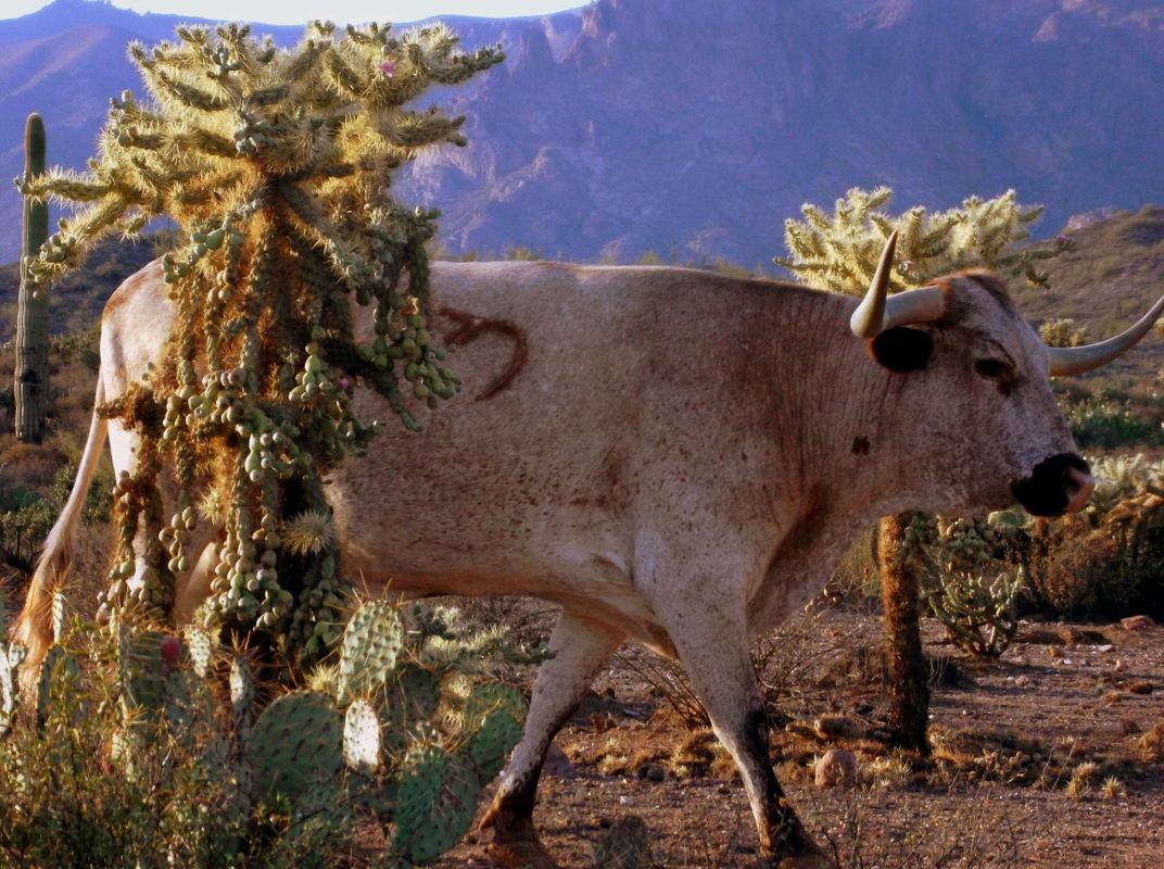 Driving a dirt road to the Peralta trailhead in the Superstition Wilderness, I came across this bull casually wandering the Sonoran Desert.