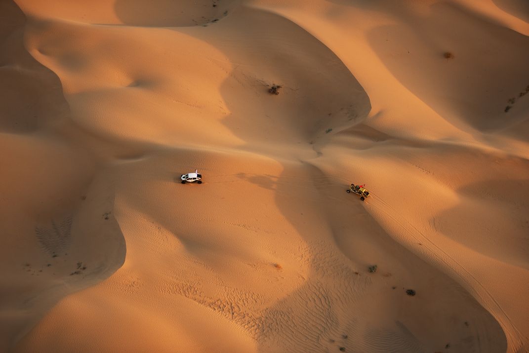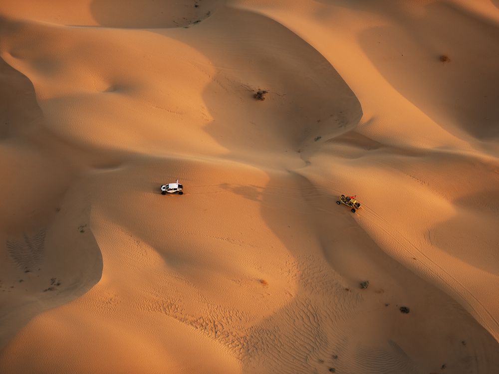 Two ATVs carve tracks across California’s golden dunes, racing through shifting sands in a fleeting moment of speed, light, and desert silence.