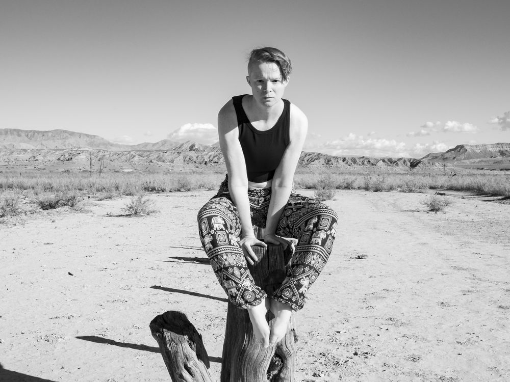 A woman propping herself up on a dead tree stump looking straight into the camera.
