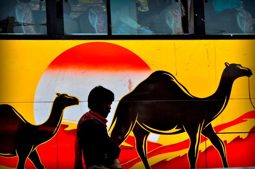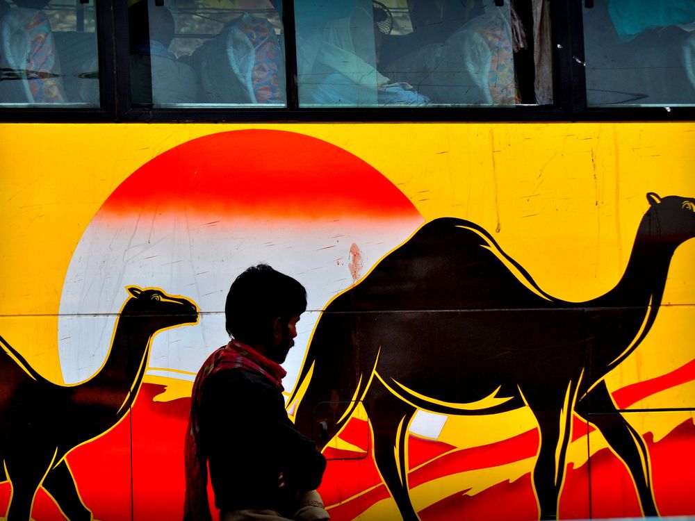 I was looking for some shots in a transit camp in KOLKATA,suddenly I saw a bus with a graffiti of a desert .I was waiting for a moment to complete my picture and include that passer by .