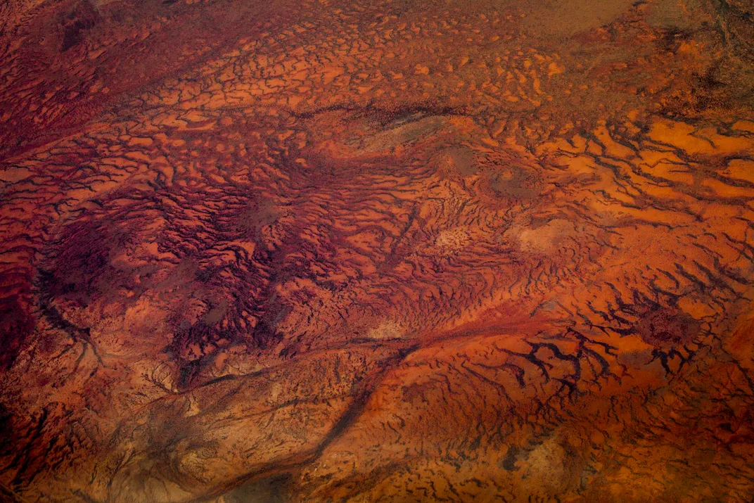 Flying from Perth to Broome in Western Australia is like flying over the surface of Mars and I find myself captivated by the vivid expressions of the underlying geology. The rocks that underly this desert date back as far as 2.9 billion years - some of the oldest rocks on earth. Structures like these wrinkles betray its turbulent and tectonic prehistory, now preserved by the stasis of this huge continent.